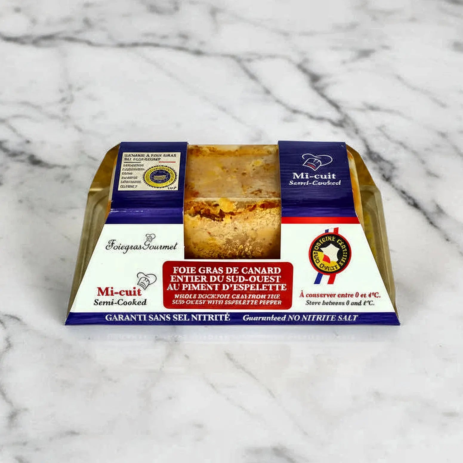 この南西地方産の鴨の全体 foie gras 半生は、繊細にエスプレット産AOP唐辛子で味付けされており、エレガントで本格的なスパイシーさを加えています。