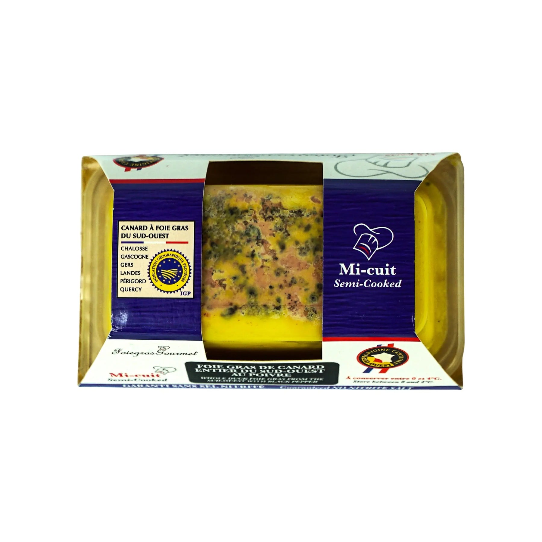 Ontdek deze hele eendenlever uit het Zuidwesten, half gegaard met een delicate toets van zwarte peper die subtiel zijn rijke en complexe aroma's onthult. Koel bewaard enkele maanden ten hoogste, biedt het een smeltende textuur en een verfijnde smaak, perfect voor een verfijnde proeverij of om uw feestelijke voorgerechten te verfraaien. Vervaardigd met respect voor tradities, garandeert dit product een uitzonderlijke kwaliteit en een authentieke smaakervaring.
